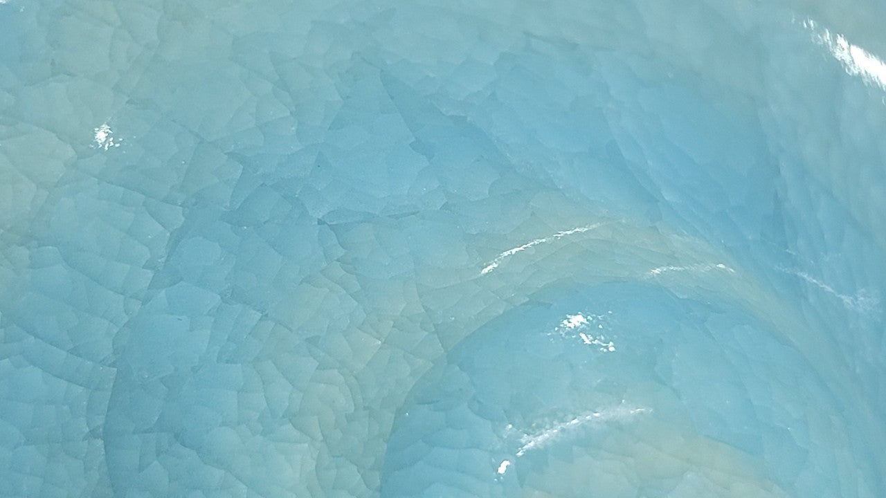 This is a glossy, Azure, high-temperature glaze with an ice-cracking effect. After firing, it forms blocky cracks. The thicker the glaze, the larger the blocks, and the more pronounced the ice-cracking effect.