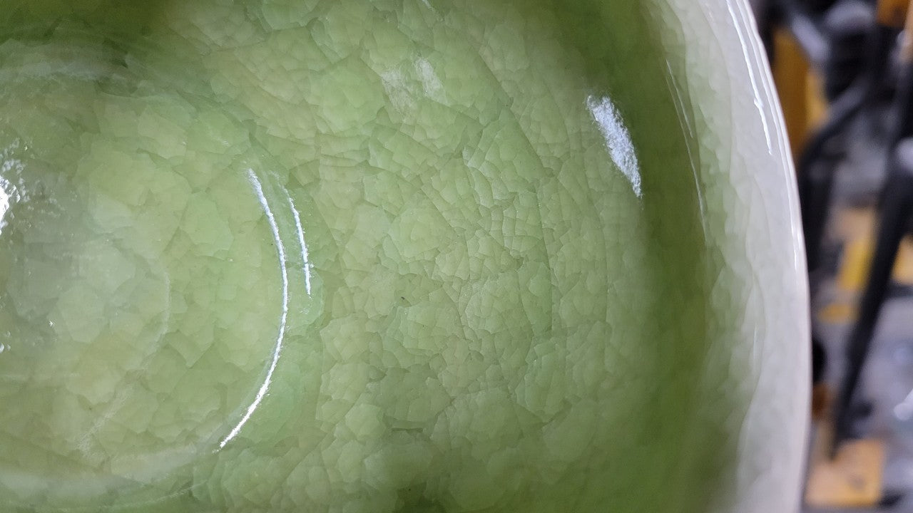 This is a glossy, green, high-temperature glaze with an ice-cracking effect. After firing, it forms blocky cracks. The thicker the glaze, the larger the blocks, and the more pronounced the ice-cracking effect.