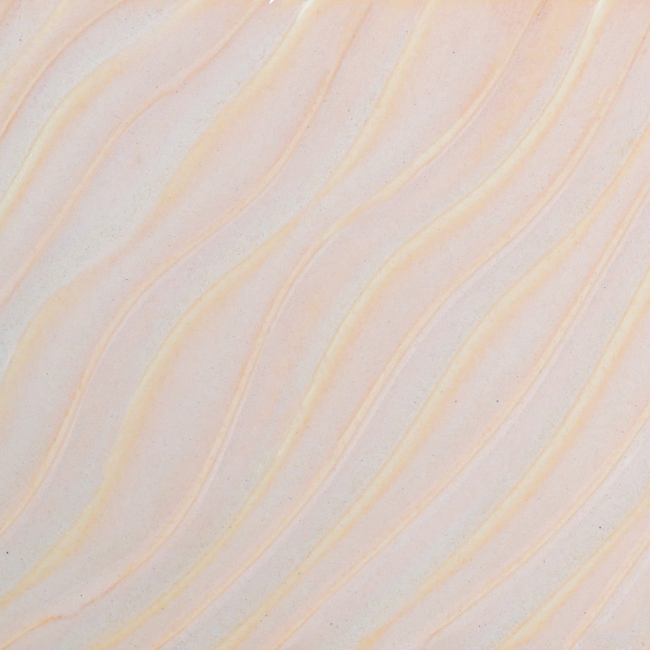 A glossy pale pink glaze like a fresh flower. Breaks across textured surfaces and develops a peachy float when thick.