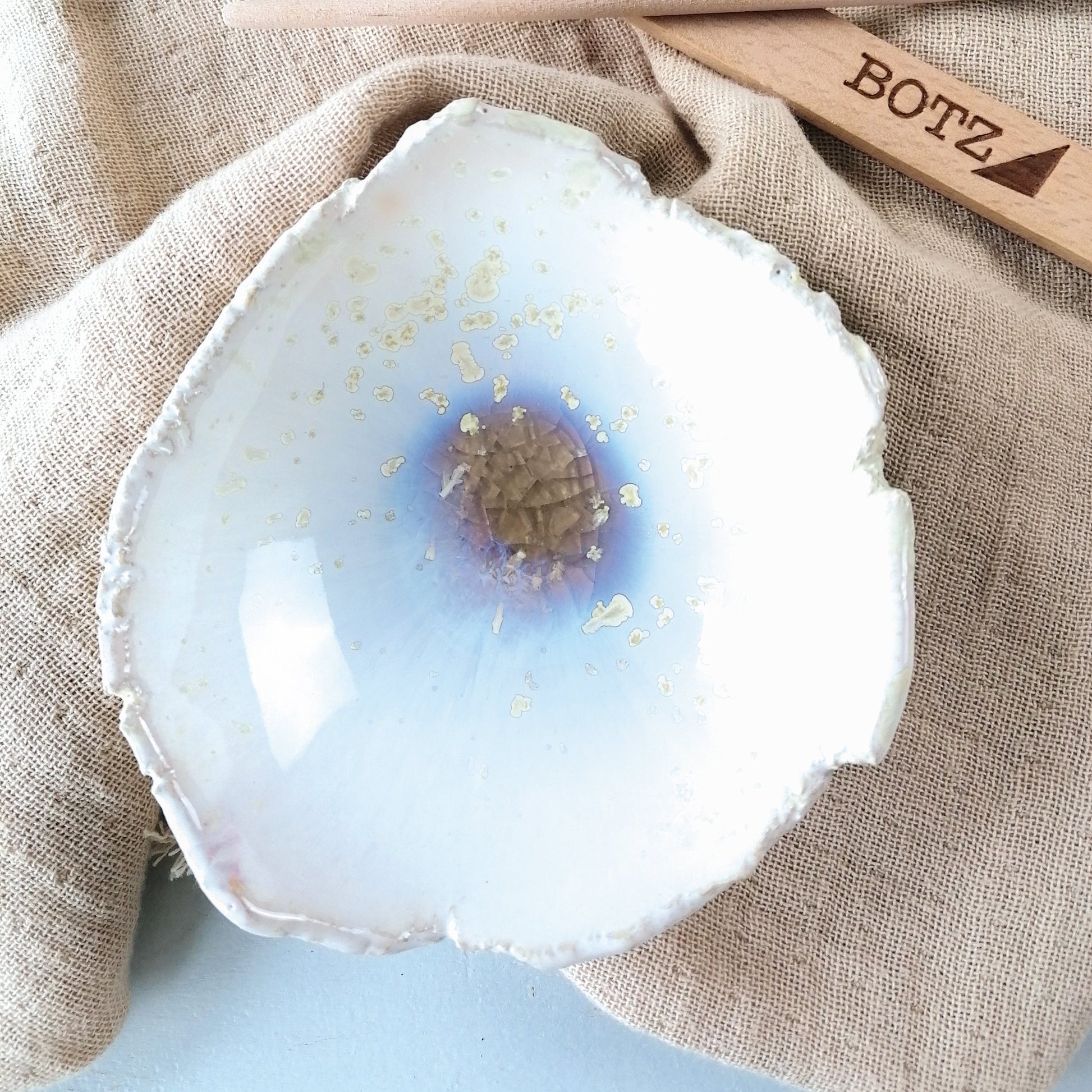 - Apply BOTZ Plus pure on stoneware clay, fired at 1250°C: Result is an awesome glossy blueish crystalline glaze.