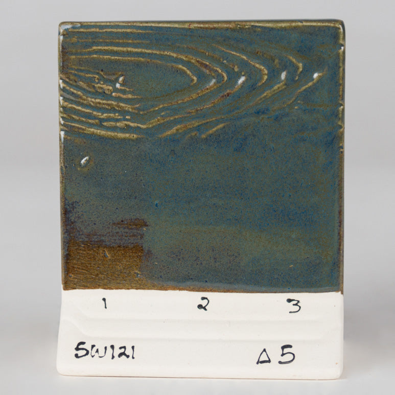 Cone 6 oxidation: Smoke is an opaque grey-blue stoneware glaze with soft, subtle variegating hues. Application thickness strongly influences the fired color; surface texture will also produce variegation during the firing.